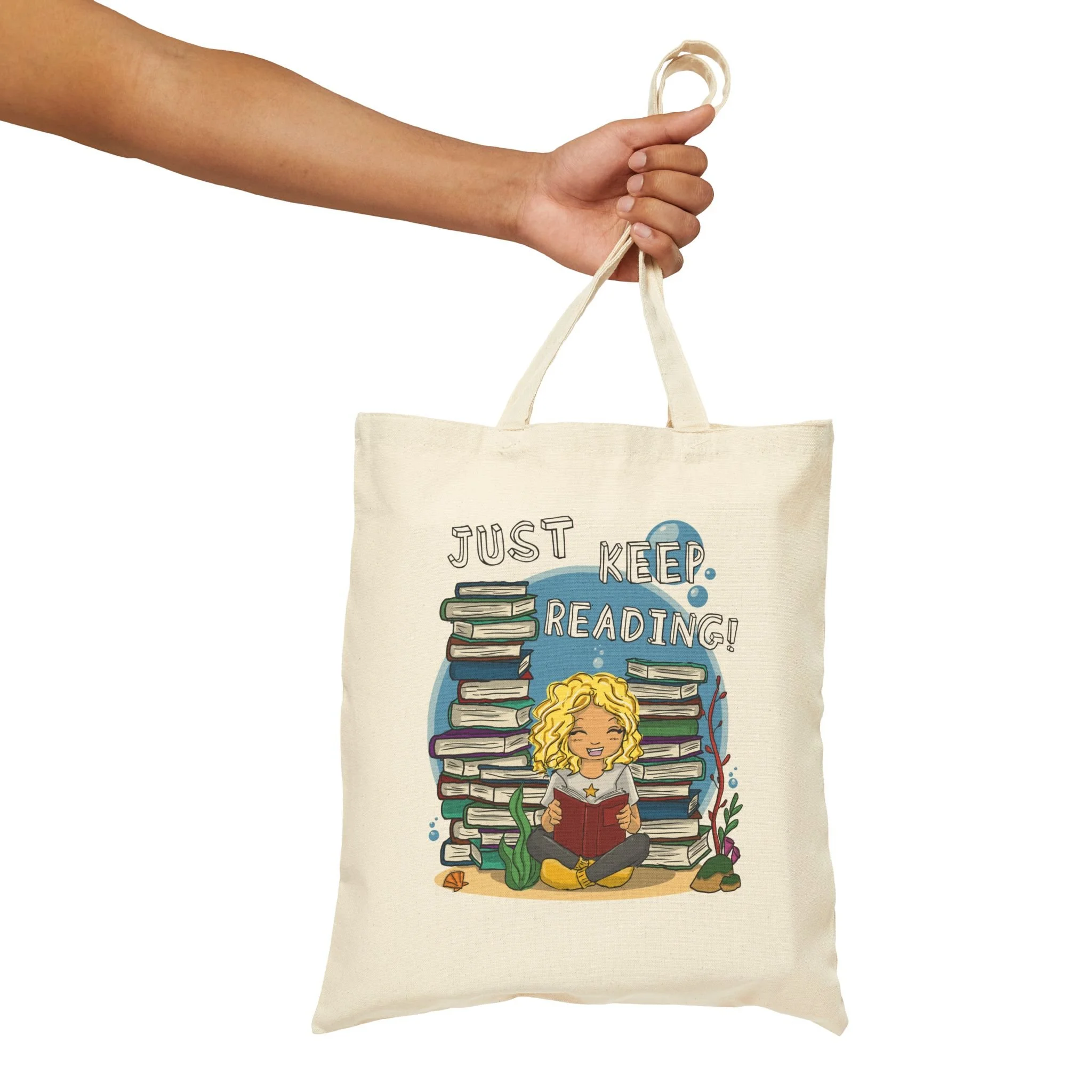 A roomy, sturdy canvas tote printed with a warm, bookish illustration — it invites slow afternoons and stacks of stories. The natural cotton surface shows off the colorful artwork: a content reader nestled against a tower of books, surrounded by cozy details and the encouraging phrase “Just Keep Reading.” Carry it to the library, tuck it under your arm for a cafe writing session, or use it to wrangle paperbacks and notebooks on days when you want calm company. The heavy-weight fabric and flat, structured sides give the bag a reliable feel; the long self-fabric handles sit comfortably over the shoulder. This tote fits into a life that values lingering, pages turned slowly, and the small rituals that keep a reading habit alive.